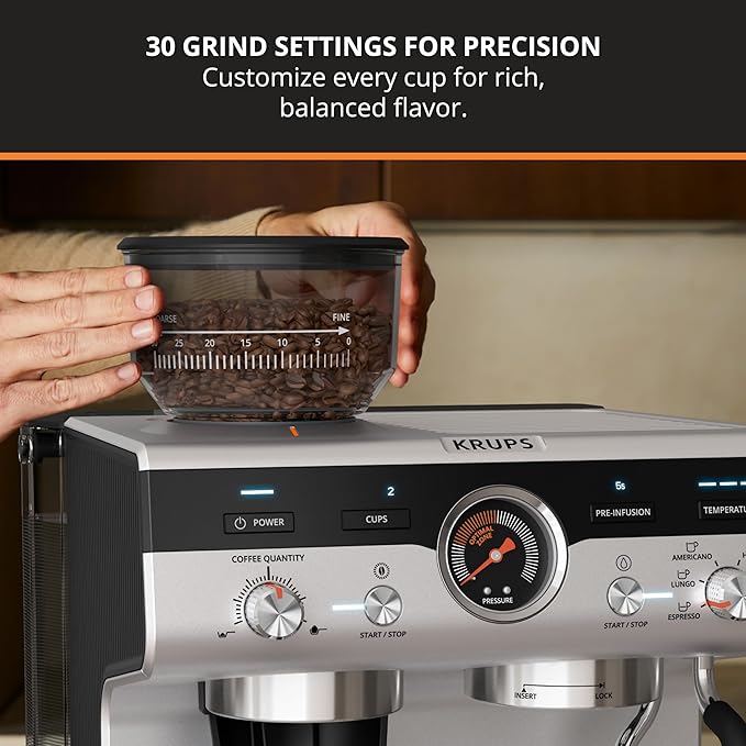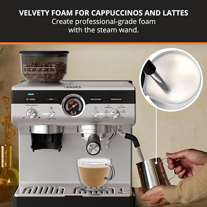 KRUPS Precision Espresso Coffee Machine with Grinder, Latte & Cappuccino Maker, Pump Pressure + Milk Frother Steam Wand, Adjustable Grind Settings for Barista-Quality Results, Stainless Steel & Black