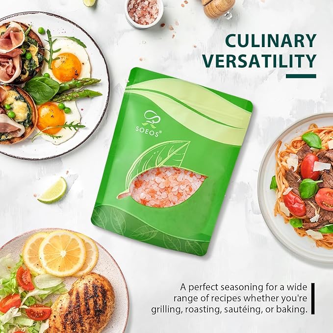 - Versatile Usage: Soeos Coarse Pink Salt can be used in a wide range of culinary applications. It adds depth and complexity to meats, vegetables, salads, and various dishes. Its exquisite flavor and texture make it a versatile and gourmet choice for both cooking and finishing your meals.