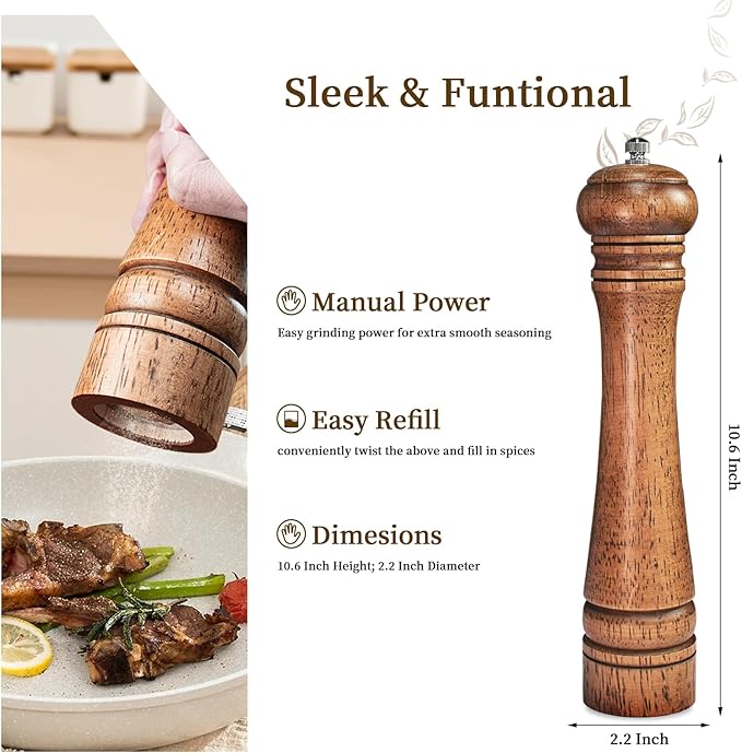 - Spice up Your Dishes: Looking for an easy way to enhance your meals? Our 10 Inch oak wood pepper grinder is perfect for adding your favorite spices like pepper, sea salt, and Himalayan salt. It grinds perfectly for an even distribution on all your dishes