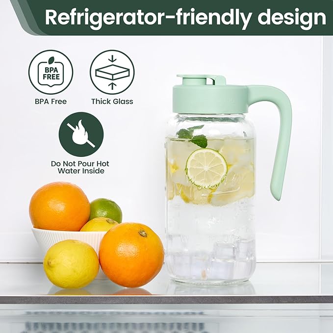 - Effortless Pouring Glass Pitcher with Lid: Enjoy effortless pouring with the wide-mouth flip-cap spout and non-slip handle. Say goodbye to unwanted spills and mishaps, as our lid pops open to ensure your content won't leak or spill.