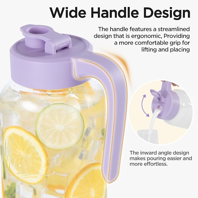 - Effortless Pouring Glass Pitcher with Lid: Enjoy effortless pouring with the wide-mouth flip-cap spout and non-slip handle. Say goodbye to unwanted spills and mishaps, as our lid pops open to ensure your content won't leak or spill.