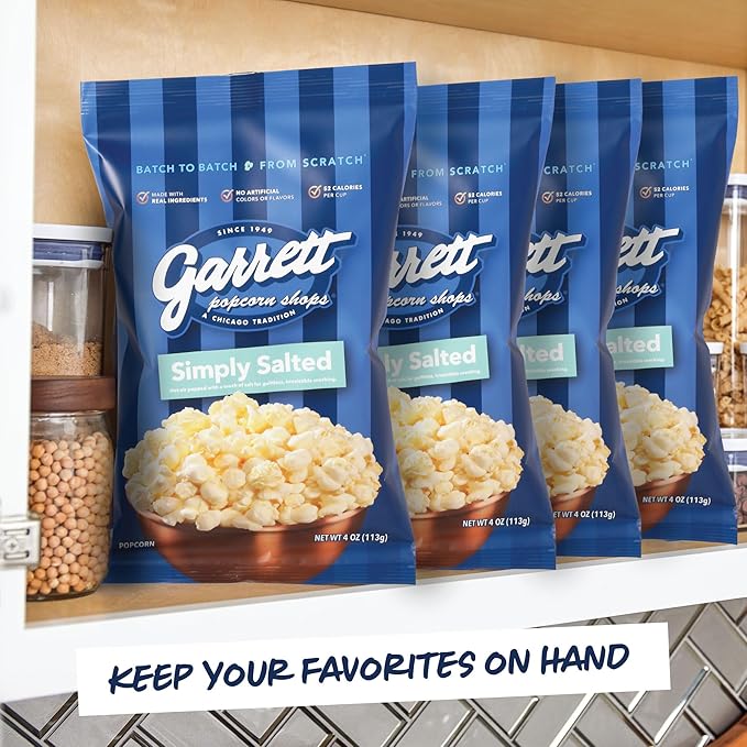 Garrett Popcorn Simply Salted, 4.0oz, 4 Bags, Light Salty Snack, Vegan, Gluten Free, Only 3 Ingredients, Popped Popcorn Bags