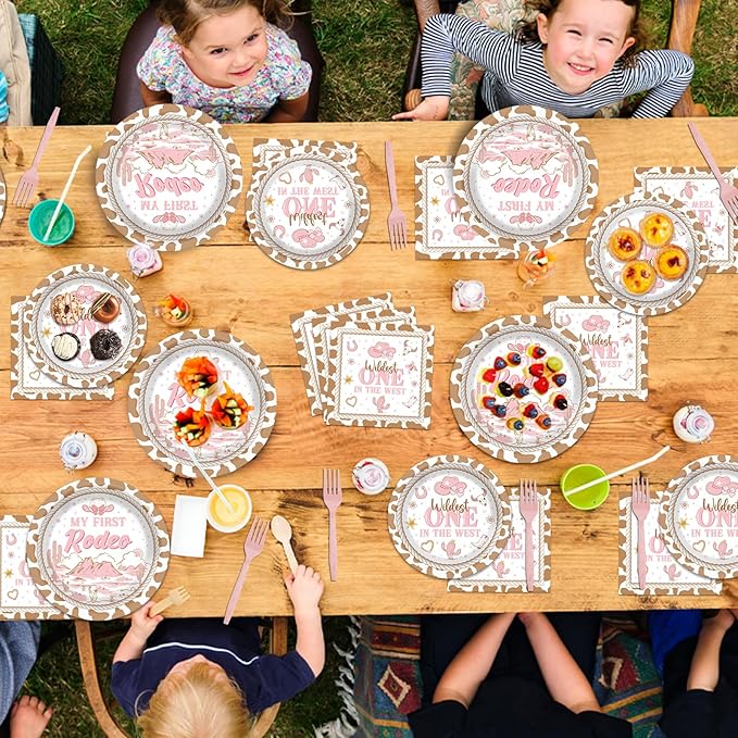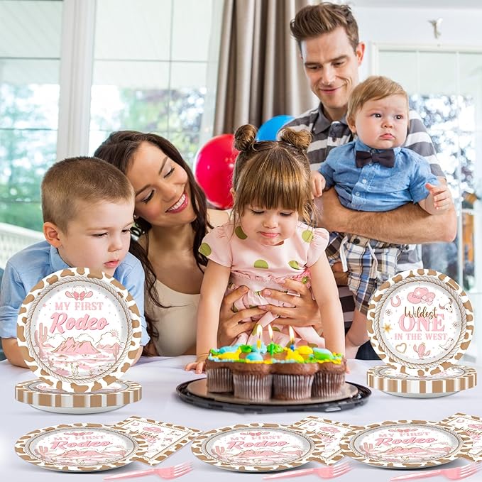 - My first rodeo tableware set: This set includes 24x 9inch cowgirl theme dinner plates, 24x 7inch western 1st birthday party dessert plates, 24x 6.5inch western cowgirl 1st birthday party napkins, and 24 pink forks, providing enough supplies to serve 24 guests.