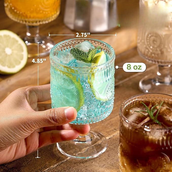 - [Vintage Charm] These vintage goblet glasses feature embossed floral designs, adding a touch of old-world charm to any table setting. Perfect for wine, tea, beer, or cocktails.