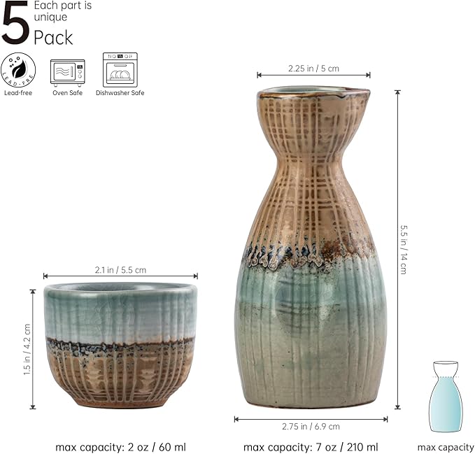 - Value Pack of 5 :UNICASA sake set includes 1 sake bottle(7oz/210ml), 4pcs sake cups (2oz/60ml), providing everything you need to enjoy a traditional sake experience.