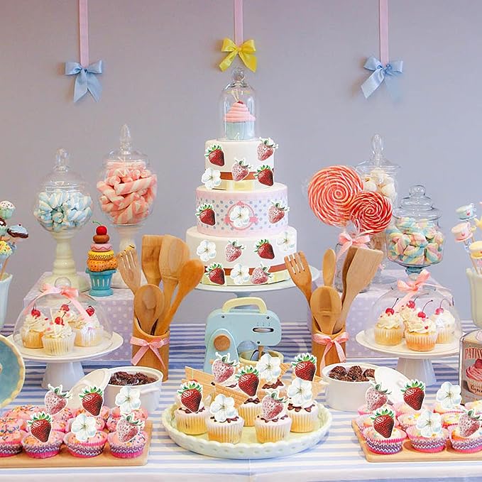- Unique Design and Proper Size! Brace yourself for a ton of compliments.Your guests will love the unique strawberry design on the cake and cupcake, these edible strawberry cupcake toppers can be used at different theme party decorations