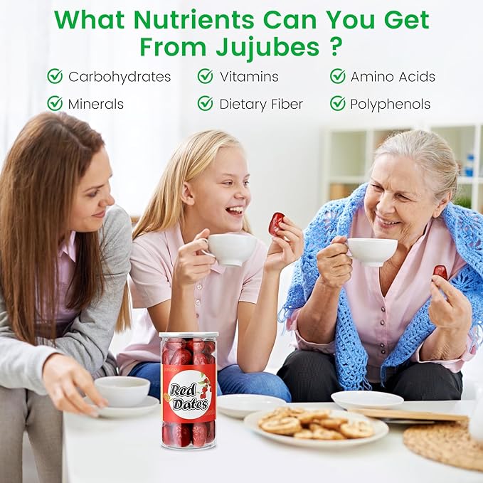 - Natural Sweetness: Enjoy the naturally sweet flavor of jujube dates, perfect for satisfying your sweet tooth in a healthy way.Each date features full granules, thin skin, and thick meat, offering a satisfying chew and a ruddy, appetizing appearance.