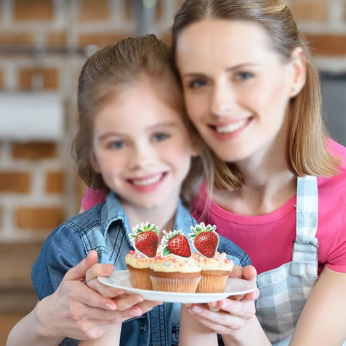 60 Pack Edible Sweet Strawberry Cupcake Toppers Rice Paper Wafer Paper First Birthday Strawberry Cake Picks for Fruit Baby Shower Birthday Berry Sweet Kids Birthday Cake Decorations