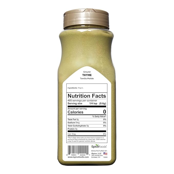 - ✔ PREMIUM GROUND THYME – Fresh, aromatic, and finely ground for easy use. ✔ BULK SIZE FOR VALUE & FRESHNESS – 11 oz resealable pack ensures long-lasting flavor. ✔ VERSATILE HERB – Ideal for seasoning meats, soups, stews, and Mediterranean dishes. ✔ KOSHER-CERTIFIED – High-quality, pure thyme that meets strict Kosher standards. ✔ EARTHY & SAVORY FLAVOR – Adds depth and warmth to a variety of recipes.