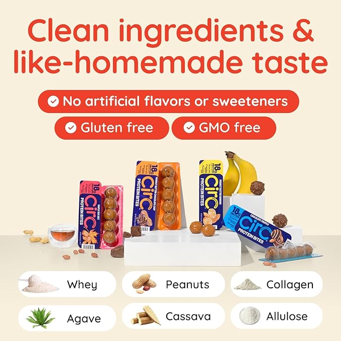 - PORTABLE PROTEIN BITES: CirC reimagined the protein bar as 5 snackable protein balls perfect for on-the-go, at work, or post-workout. Made with wholesome ingredients like peanuts, whey, agave, and collagen, these protein balls have a smooth texture and clean, natural taste.