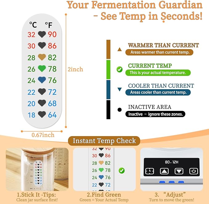 - Thermometer Strip for Instant Temp Checks: Attach Temperature strip to your jar for 24/7 temperature tracking. Waterproof design prevents stickers from falling off, with color-coded zones (green=ideal, orange=too hot,blue=too cold) for foolproof monitoring