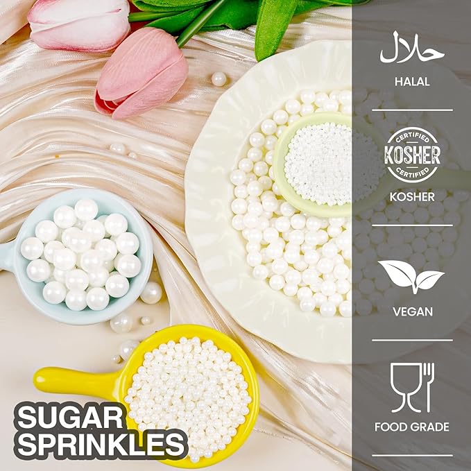 - Net Weight: 150g/5.29oz. The White Pearl Sprinkles can bring an excellent decorative effect to your desserts. White Pearl Sugar can make your baking more perfect, these pearl Sprinkles can be used to decorate Cake toppers, Cupcakes, Cookies, Chocolates, Doughnuts, Ice cream and more. Each Slightly Sweet Pearl Sprinkles has a smooth and round surface and a delicate texture.
