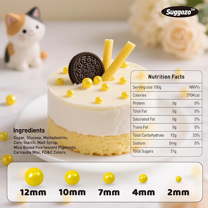 - Safe & Certified Pearls: Food-grade gold pearls sugar sprinkles made with non-GMO ingredients, 0% preservatives. Kosher/Halal-certified in facilities with no allergens (soy/nut/dairy). Tamper-proof sealed for safety.