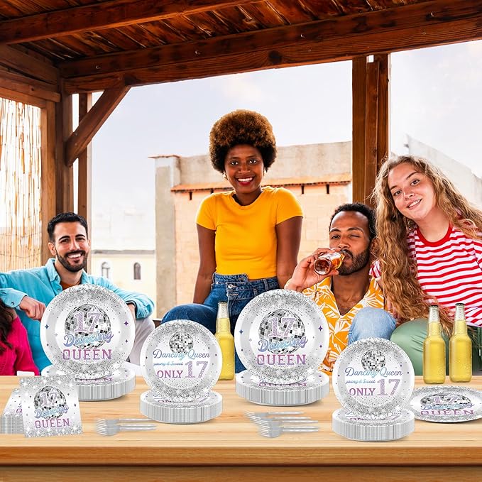 96Pcs Dancing Queen Plates and Napkins for 17 Birthday Party Decorations for Girls Silver 17 Year Old Dessert Plates Dancing Queen Tableware Set for 24 Guests 17 Birthday Party Supplies