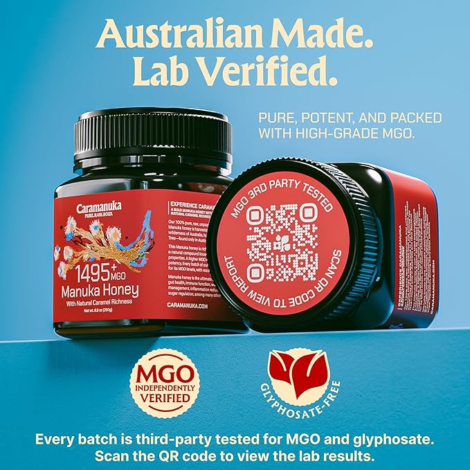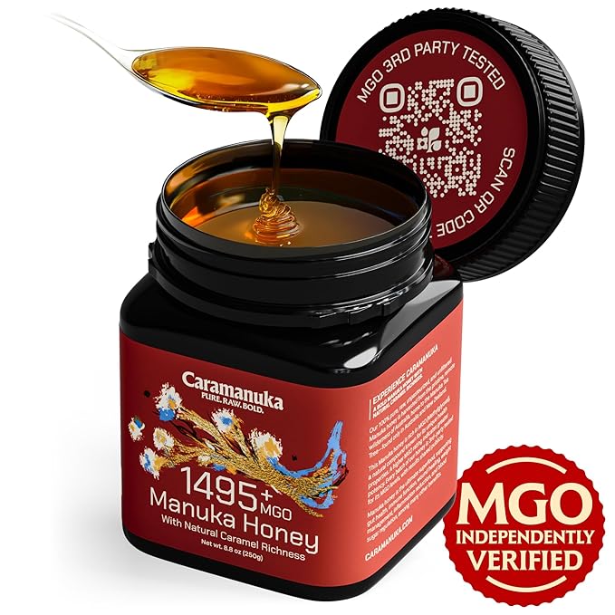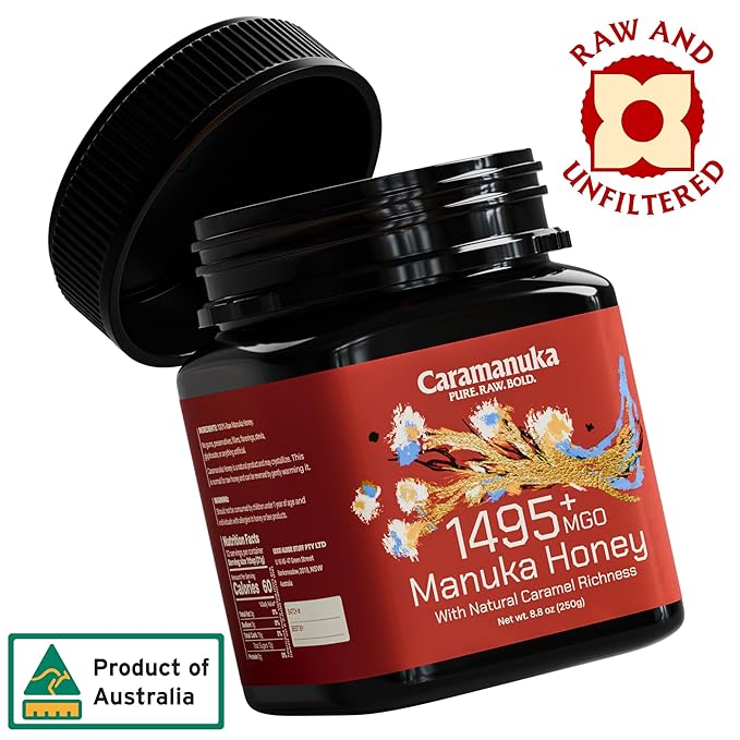 Caramanuka Manuka Honey MGO 1495+ / 100% Raw, Pure, Unfiltered & Unpasteurized, 3rd Party Tested, Ultra-Potent, Glyphosate-Free, Australian Premium Manuka Honey