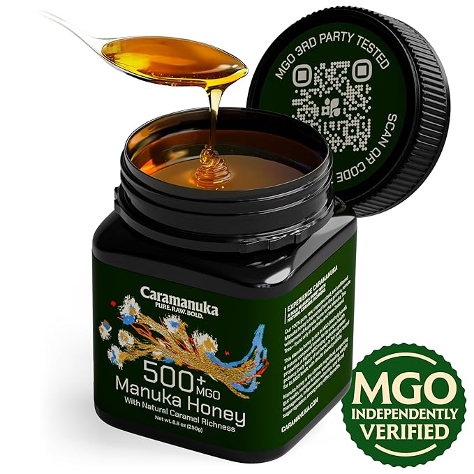 Caramanuka Manuka Honey MGO 500 – 100% Raw & Unfiltered Australian Honey, Independently Lab-Tested for MGO & Glyphosate, Bold Caramel Flavor, 8.8 oz (250g)