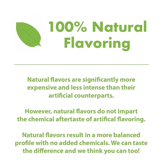 - All natural flavorings - 100% all natural flavoring resulting in a cleaner flavor profile with no chemical aftertaste