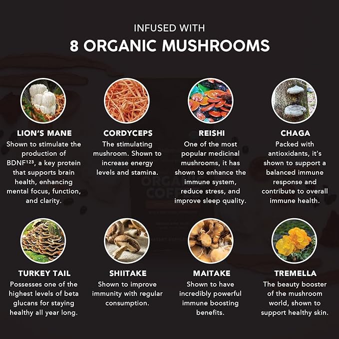 - Infused With Eight Organic Mushrooms – Each sip is infused with a blend of 8 organic mushrooms including lion’s mane, cordyceps, reishi, and five additional organic mushrooms These carefully selected mushrooms are known for their potential to support mental clarity, focus, and natural energy, turning your morning brew into more than just a routine - it’s a mindful way to fuel your day.