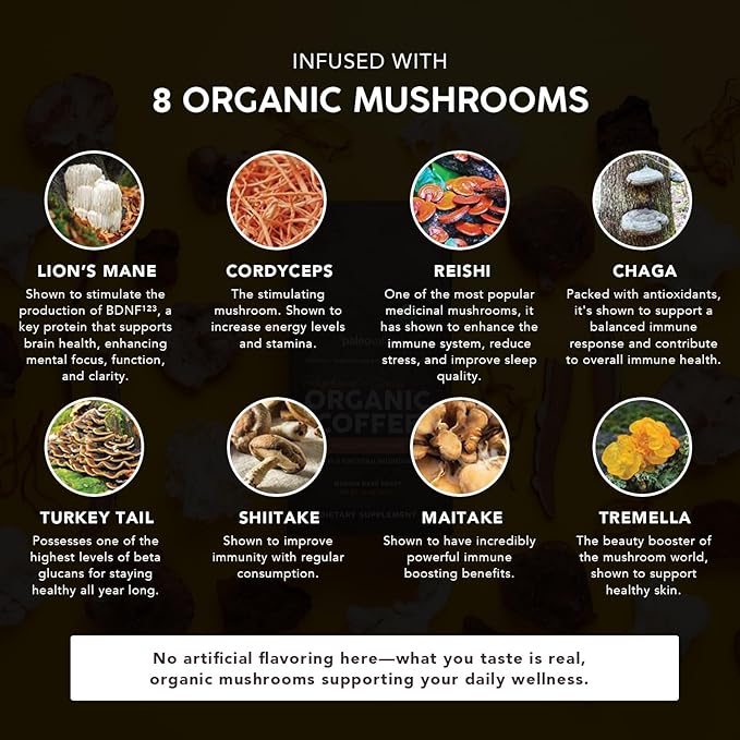 - Infused With Eight Organic Mushrooms – Each sip is infused with a blend of 8 organic mushrooms including lion’s mane, cordyceps, reishi, and five additional organic mushrooms, all selected for their potential to support focus and stamina. Unlike conventional mushroom coffees that use mycelium, Paleovalley only uses the full fruiting body, ensuring a higher concentration of beneficial compounds in every cup.
