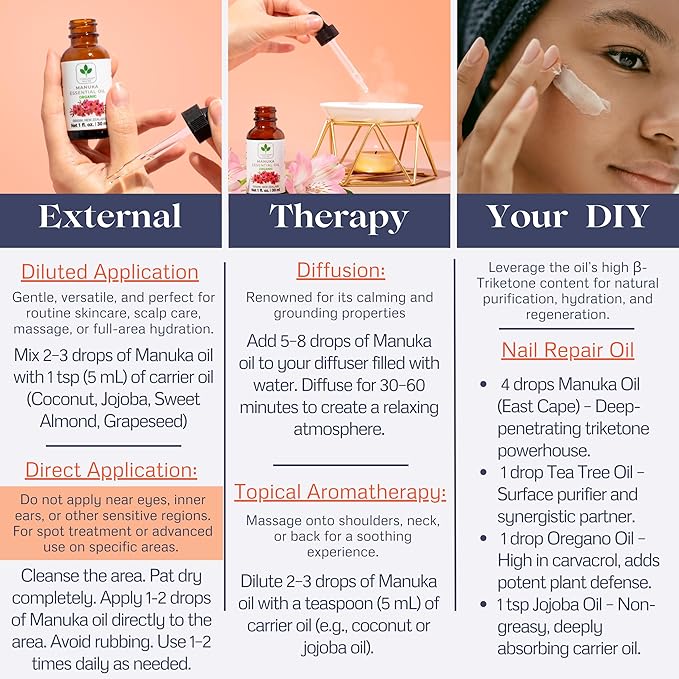 - Premium Manuka Oil from New Zealand: Sourced from the pristine East Cape region, this 100% pure, undiluted manuka oil is a powerful therapeutic-grade essential oil known for its high triketone content, making it superior for skin, hair, and nail care. It is cold-pressed and organically extracted, ensuring you get the most potent and effective oil for your needs.
