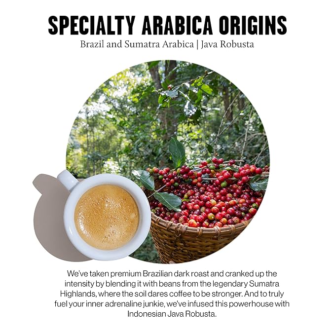 - BOLD & INTENSE: Full-bodied, bold dark roast coffee made from a carefully selected combination of Brazil and Sumatra Arabica and Java Robusta beans for rich, intense flavor.