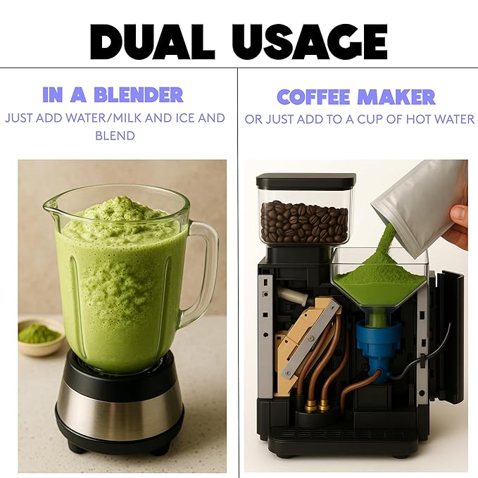 - Doubles as a matcha powder for lattes and iced drinks; works with machines or manual prep