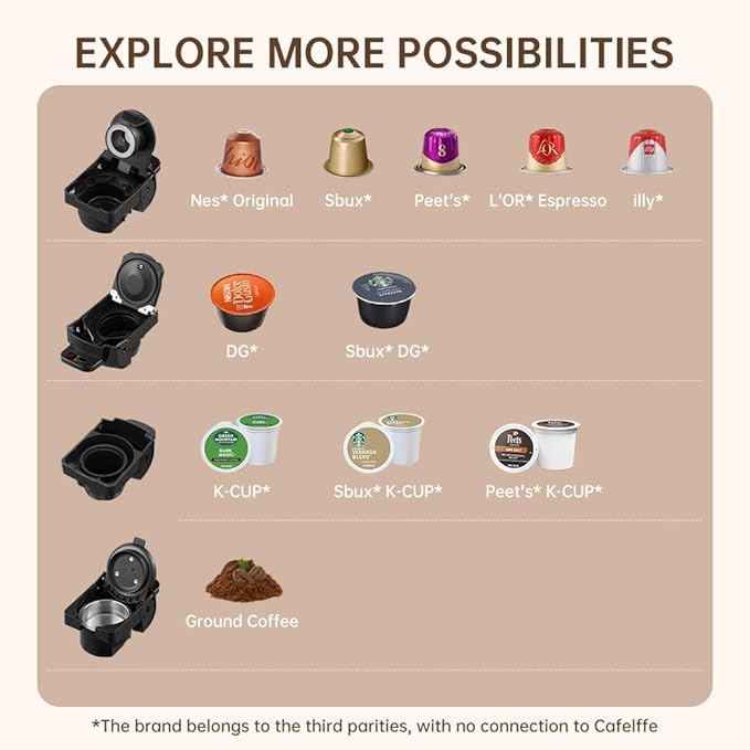 - [4 In 1 Espresso Machine】CAFELFFE MK-603 is designed to work seamlessly compatible with K Cup Pods, Nes* original pods, DG* pods. It is also suitable for ground coffee, so you can brew a perfect cup of coffee with the right amount of ground coffee for your taste. If you are looking for a great espresso machine, look no further than us.