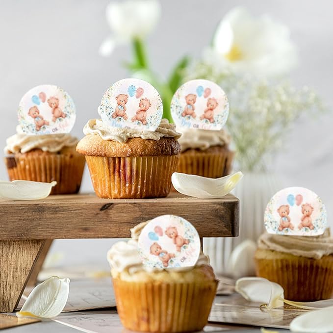 40Pcs Edible Gender Reveal Bear Cupcake Toppers Wafer Paper Boy or Girl Baby Shower Cake Decorative Supplies Jungle Animal Theme Birthday Party Cake Decorative Supplies