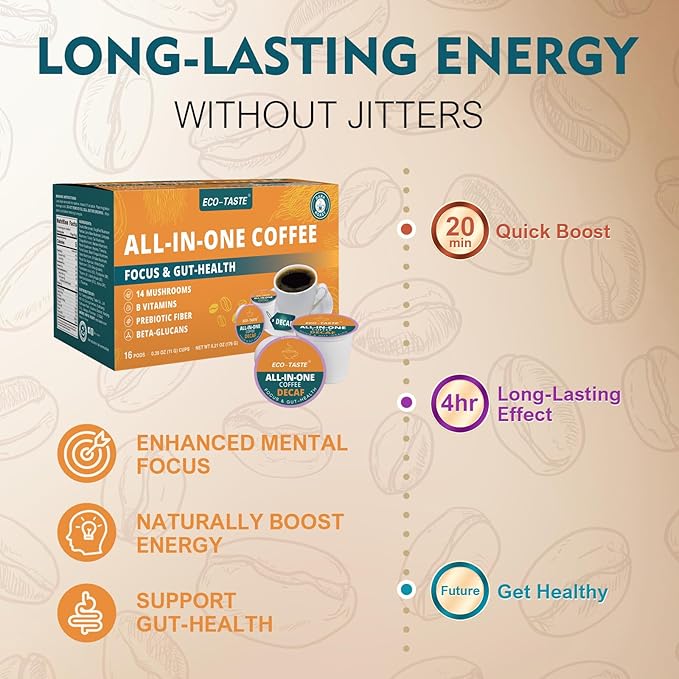 - Experience the Nutrient-Rich Decaf Mushroom Coffee: Enjoy Dark roast Arabica coffee infused with extracts from 14 functional mushrooms, including Reishi, Turkey Tail, Lion’s Mane, Chaga, Cordyceps, Maitake, Poria Cocos, Black Fungus, Mesima, Black Fungus, Oster Mushroom, Shiitake Mushroom, Royal sun agaricus, White button mushroom and Tremella. This blend provides clean energy, mental focus, and immune support.