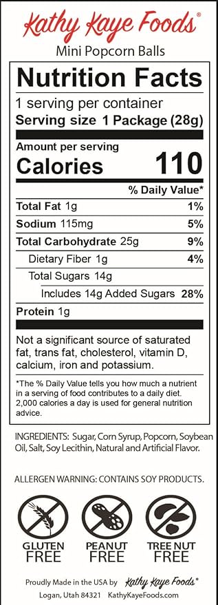 - ✅ GLUTEN-FREE & ALLERGEN-FRIENDLY – Safe snacking for everyone! These mini popcorn balls are gluten-free, peanut-free, and tree nut-free, making them a great option for kids, schools, and allergy-conscious households.