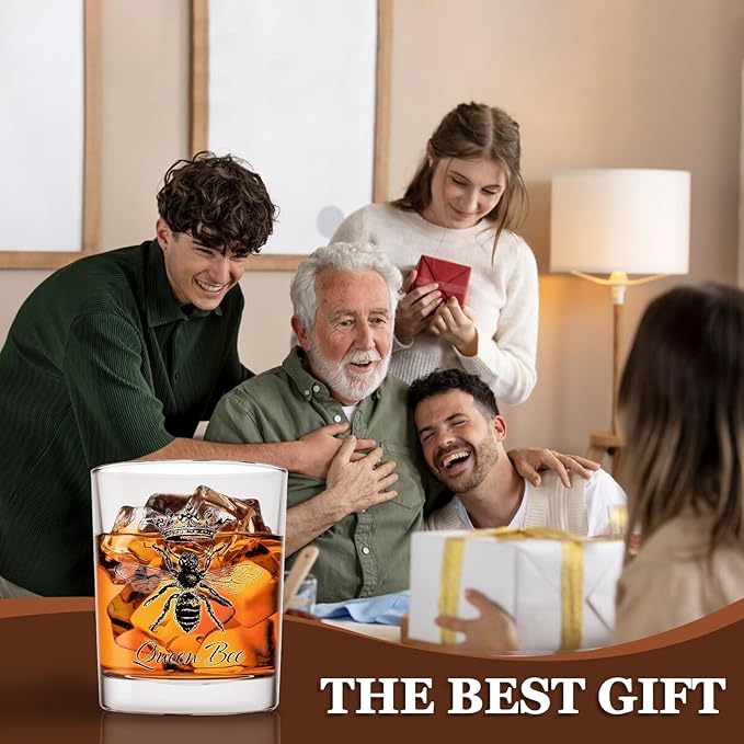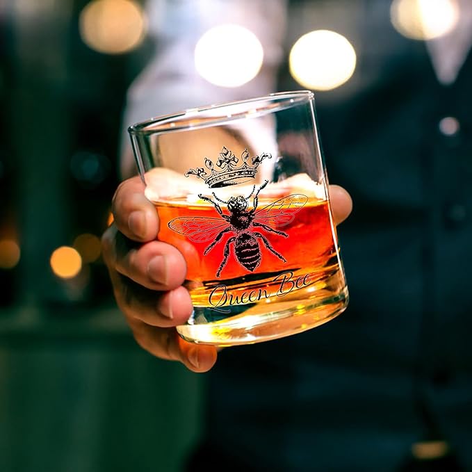 Voatok Vintage Queen Bee Whiskey Glasses 10 oz, Queen Bee Themed Gifts for Women Lovers, Old Fashioned Rocks Glasses for Women Drinking Scotch Bourbon Cocktail Liquor Vodka