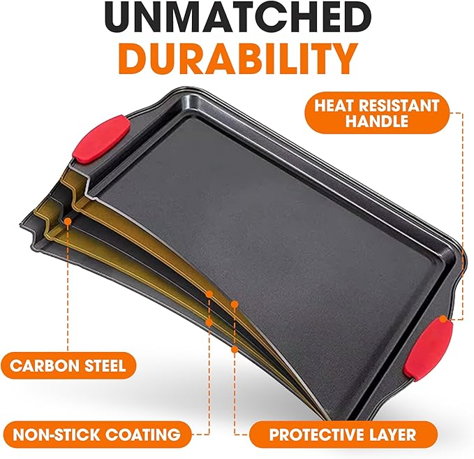 - BUILT FOR OVEN PERFORMANCE: Our baking trays for oven are heat-safe and warp-resistant, made from durable carbon steel. Each baking pan is oven-safe up to 450°F for reliable performance meal after meal.