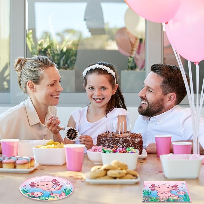 - Cute Axolotl Animal Theme Design:Reptile birthday party decorations design cute,disposable paper plates and napkins features vivid pink axolotl,coral,sea grass pattern.They can be paired with your axolotl party decorations such as axolotl happy birthday banner,axolotl balloons,cartoon axolotl tablecloth,axolotl cake topper.Fantastic design brings fun and unique style to your party decor