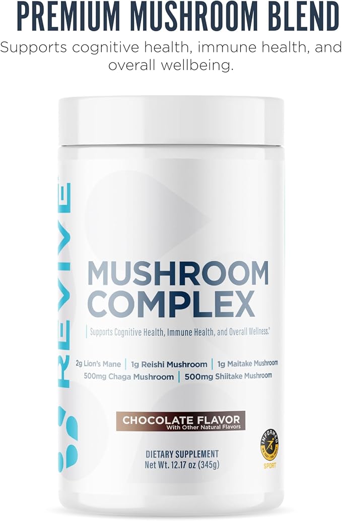 - Support Focus, Immunity, and Relaxation: Formulated using the fruiting bodies of functional adaptogenic mushrooms like Lion’s Mane, Reishi, and Chaga, Mushroom Complex by Revive is here to help you feel real benefits, from better focus and mental clarity to stronger immunity. Flavor: Chocolate. 30 servings.