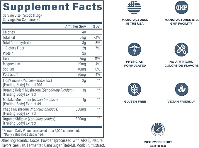 - Key Ingredients: Lion's Mane enhances cognitive function, helping you stay on top of your game mentally while Reishi helps promote better sleep and overall well-being. Maitake and Shiitake give your immune system the boost it needs to keep you feeling your best, and Chaga helps with joint and skin health, keeping you looking and feeling youthful.