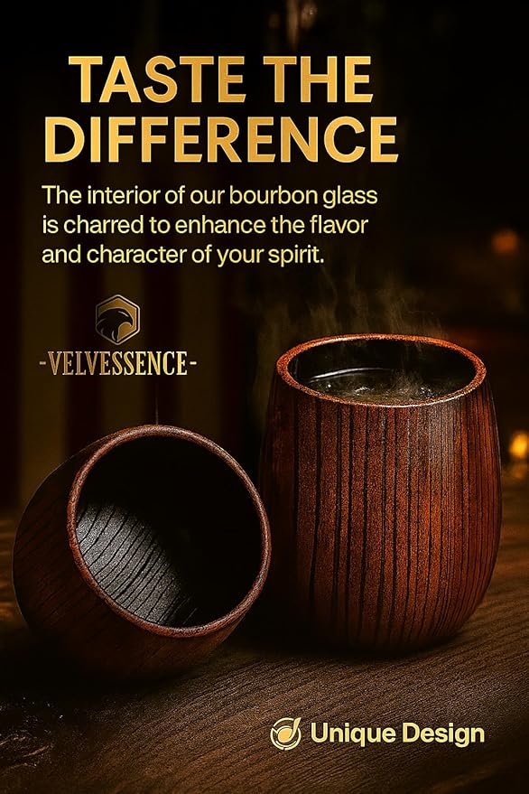 - HANDCRAFTED CHARRED OAK BOURBON GLASS : Premium 6oz wooden whiskey glass made from natural oak with a charred interior that enhances smoky aroma and authentic flavor. Ideal for bourbon, scotch, whiskey neat, rum, tequila, or cocktails, this rustic tumbler adds unique character while providing shatterproof durability. Perfect for whiskey tasting, cigar lounge rituals, camping, patio gatherings, or home bar displays, making it a standout piece in any premium barware collection.