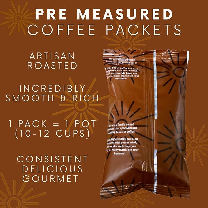 - PRE MEASURED CONVENIENCE - Each individual Packet is for a 10-12 Cup drip maker to make 1 full pot. The premeasured pouches keep your grinds fresh for over a year, ensuring each sip will be a silk smooth gourmet experience.