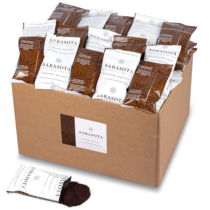Sarasota Coffee Packs Bulk Ground Packets | Salted Caramel Flavored | Gourmet Gift Sampler | Low Acid Mold Free Individual Single Pot Pouches for 12 Cup Coffee Maker | 1.75 Oz Bags, 100 Count