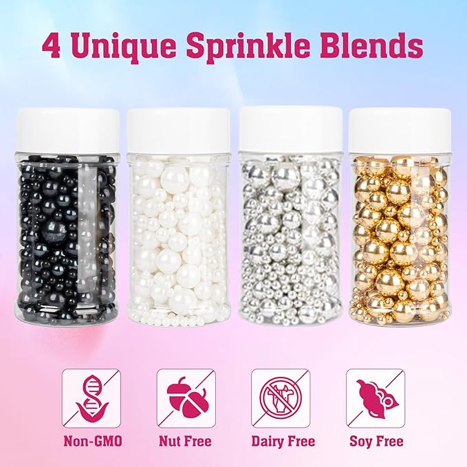 - 【4 Stunning Pearl Sprinkles Blends Pack】: This 12oz pack includes four shiny blends—gold, silver, white, and black pearl sprinkles in different sizes. Perfect for any cake, cupcake, or dessert, these candy sprinkles add a special touch to every celebration or everyday treat! With generous quantities and an affordable price, this pearl sprinkle set is ideal for all your baking adventures
