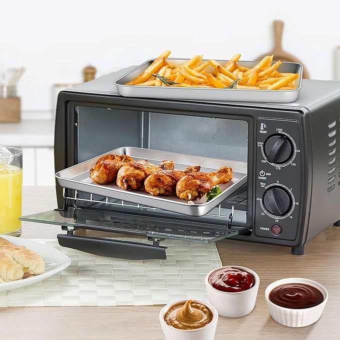 - Versatile baking, 9.3 x 7 x 1 inch half sheet pans fit most regular toaster ovens, flat baking cookie tray great for sweet or savory baking, perfect for cooking delicious dinner meals, roasting chicken, broiling steak, baking cookies, sheet cake, pizza and more, also can be used as serving tray