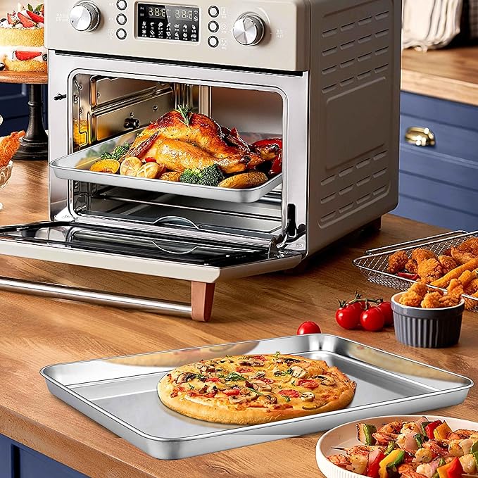 - Versatile baking, 10.5 x 8.3 x 1 inch half sheet pans fit most regular toaster ovens, flat baking cookie tray great for sweet or savory baking, perfect for cooking delicious dinner meals, roasting chicken, broiling steak, baking cookies, sheet cake, pizza and more, also can be used as serving tray