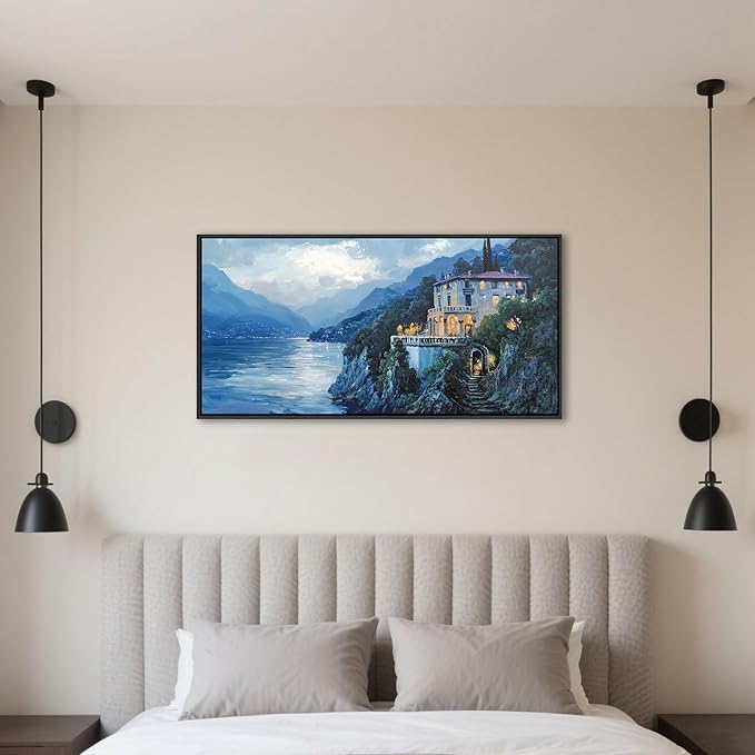 - Wall Art for Living Room: This oil paintings showcases a captivating scene of a lakeside villa bathed in warm lights against a backdrop of mountains and water. The rich, vivid colors and masterful brushstrokes create a lifelike and immersive view that can transform any room into a tranquil retreat.