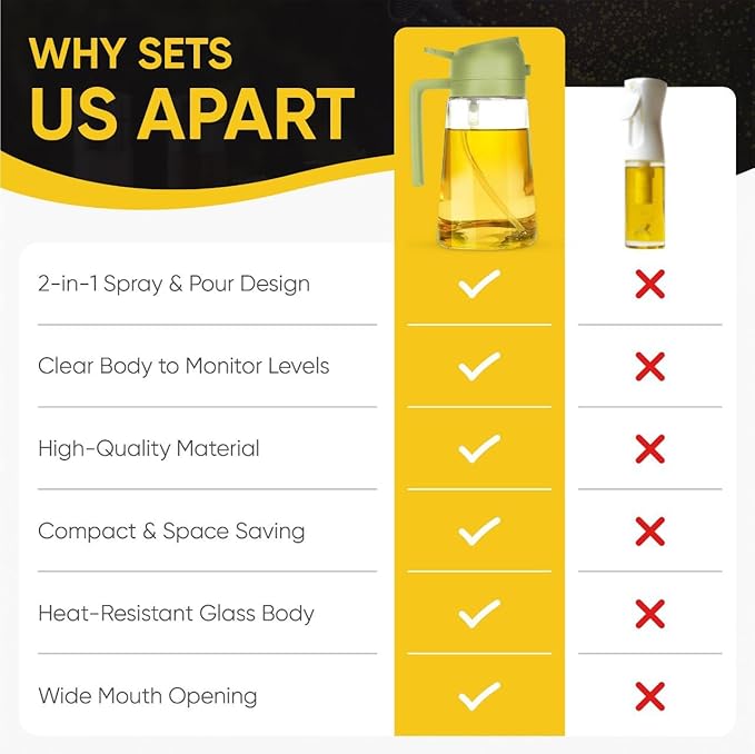 - Hands-Free Design: Designed with a front-facing nozzle and comfortable rear handle, this bottle enables you to achieve uniform sprays and pours without ever getting your hands dirty. Perfect for those quick dinners!