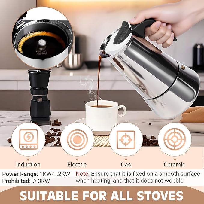 - HIGH-QUALITY 304 STAINLESS STEEL: Made of food-safe 304 stainless steel, compliant with EN13248. Our mocha pot resists coffee acids/scratches, retaining shine. The inner wall of the lower pot is sandblasted. Comes in gift-ready packaging
