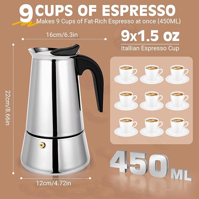 - LARGE CAPACITY OF 450 ML: Brews 9 cups' coffee, ideal for family brunches or outdoor activities. Easily prepares rich espresso with quick, efficient brewing