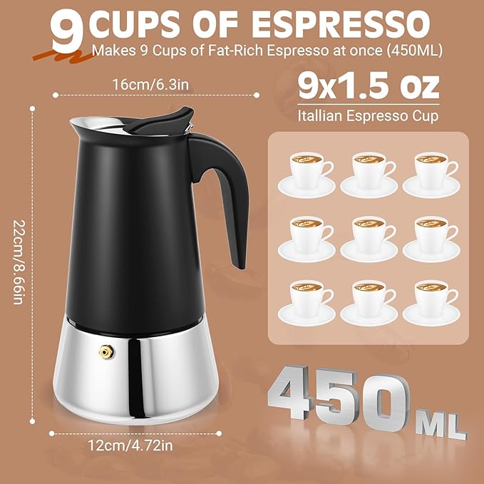 - LARGE CAPACITY OF 450 ML: Brews 9 cups' coffee, ideal for family brunches or outdoor activities. Easily prepares rich espresso with quick, efficient brewing