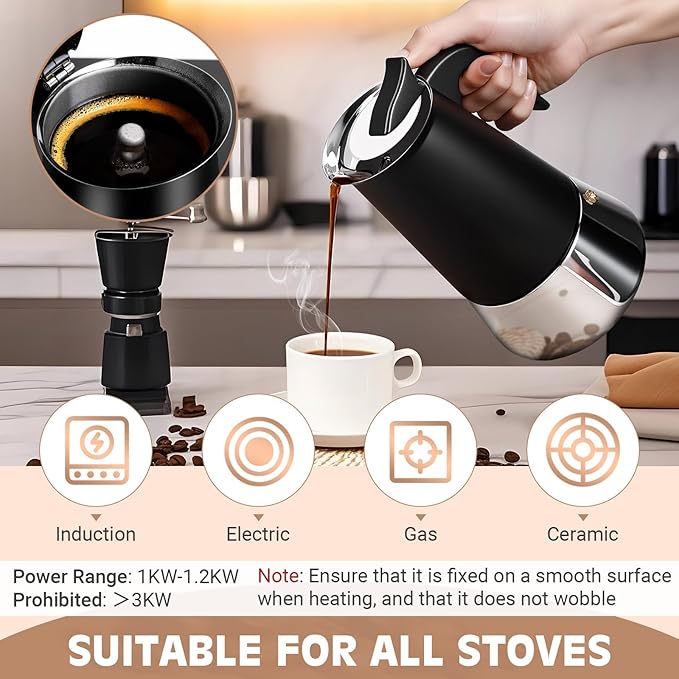 Moka Pot, 9 Cups (15.9 oz) Stovetop Espresso Maker, 304 Stainless Steel Moka Pot, Induction Compatible, Black