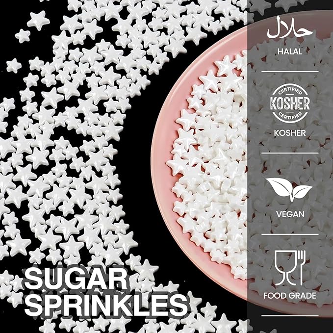 - The Edible White Star Sprinkles feature a unique mixed-size design. They are perfect for birthday cakes, cupcake toppers, cookies, ice creams, waffles, and any dessert. These sprinkles will make your baked goods prettier.