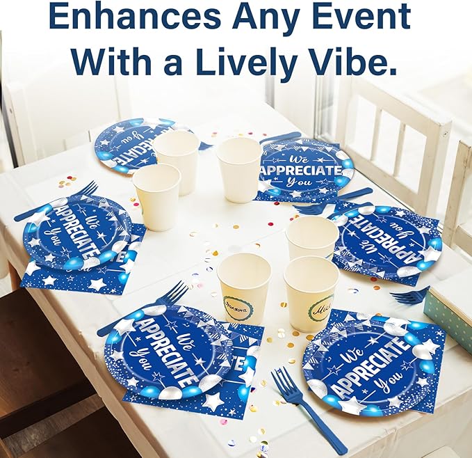- Package Includes: You will receive 24 pcs 9inch we appreciate you paper plates, 24 pcs 7inch dessert plates, 24 pcs 6.3inch appreciation party napkins and 24 pcs blue forks, enough to serve 24 guests.