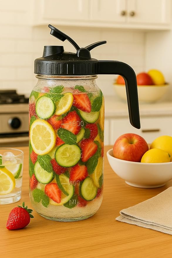 - The stylish mason jar shape with ergonomic handle fits seamlessly into modern kitchens, outdoor picnics, or fridge doors. Ideal for home, office, or gifting—hydration has never looked this good.